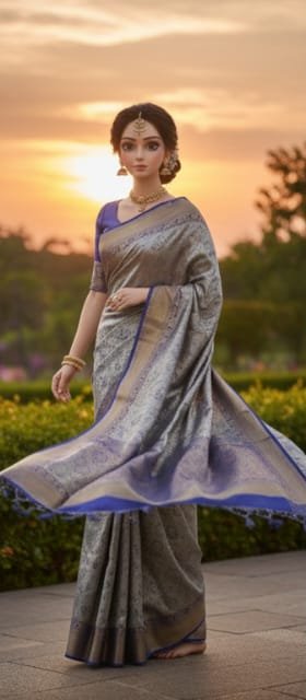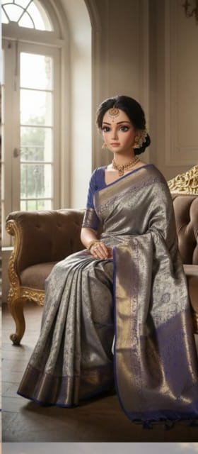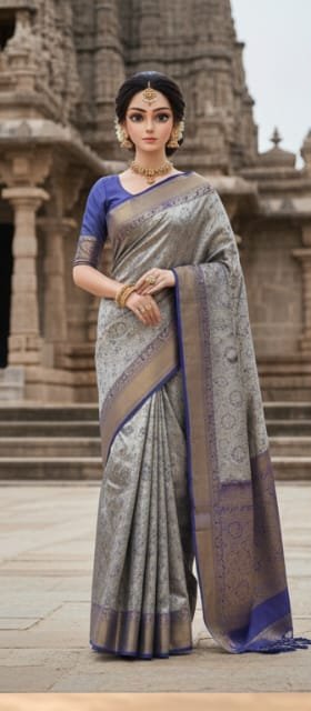 Indulge in timeless elegance with this exquisite silk saree, expertly crafted in a lustrous silver shade and embellished with intricate golden motifs. The deep blue border adds a captivating contrast, making this saree a showstopper at festive events, weddings, and cultural gatherings. Designed for comfort and sophistication, it comes in a generous size to drape beautifully on any silhouette. Elevate your style with this stunning piece and embrace the luxury of premium silk.